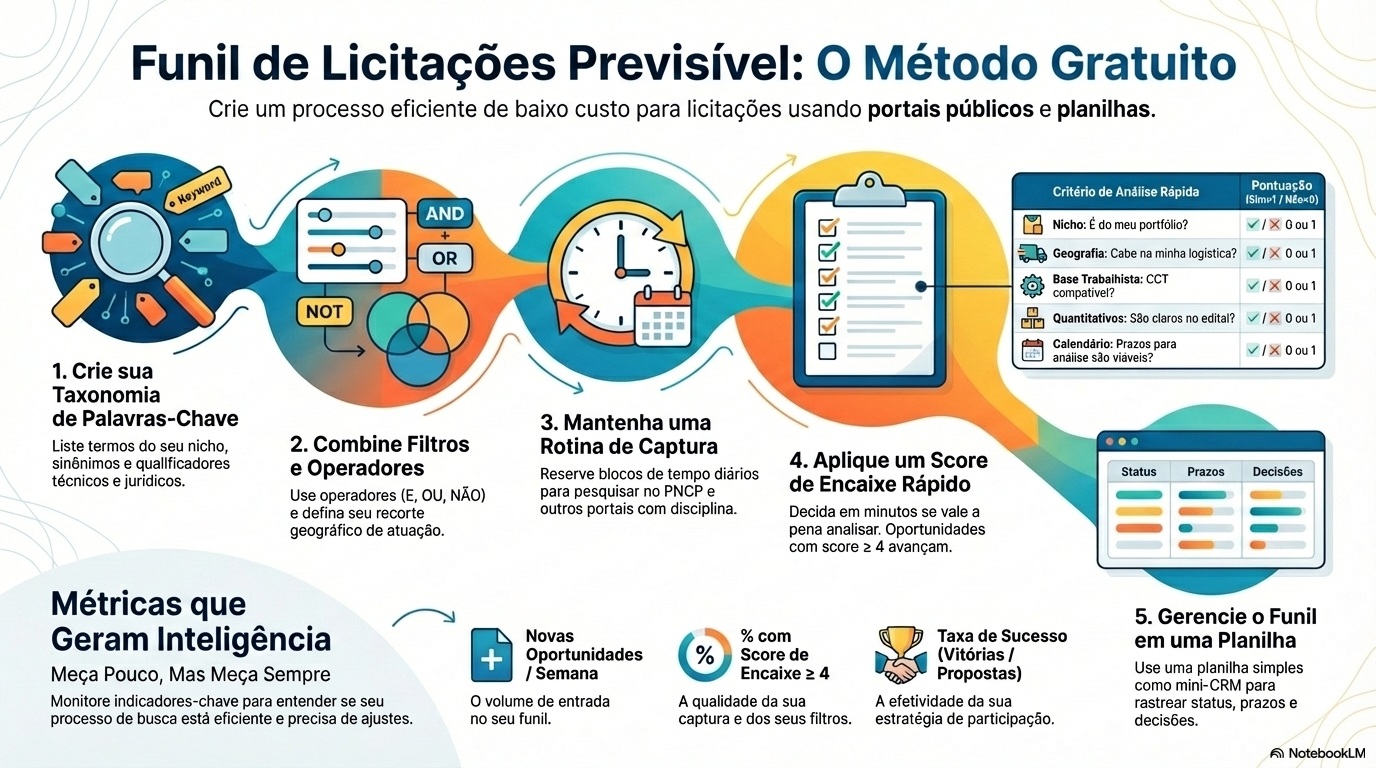 PNCP + Portais: como montar um funil previsível de oportunidades e alertas sem gastar com software